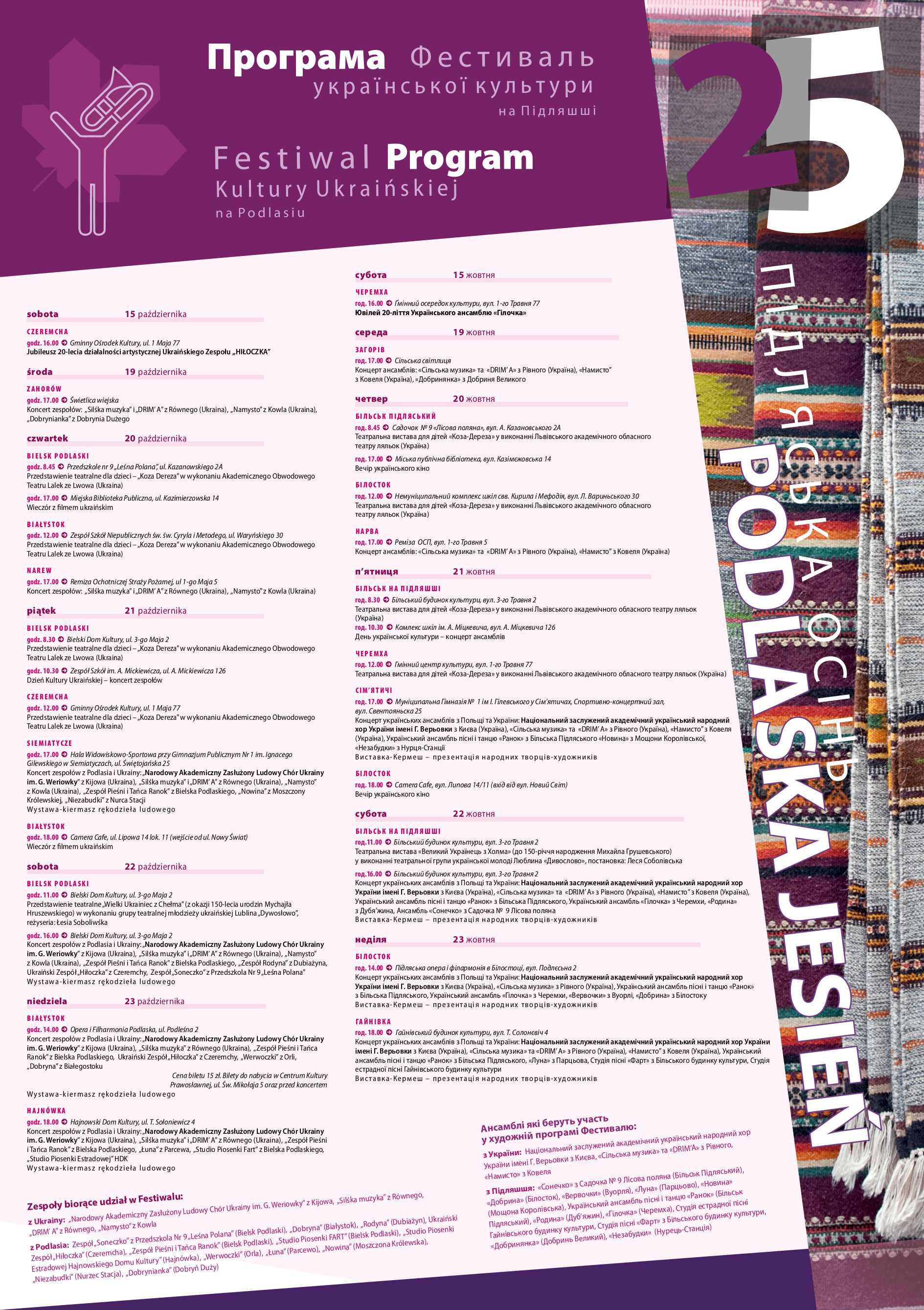 z Kijowa (Ukraina), Silśka muzyka z Równego (Ukraina), Zespół Pieśni i Tańca Ranok z Bielska Podlaskiego, Ukraiński Zespół Hiłoczka z Czeremchy, Werwoczki z Orli, Dobryna z Białegostoku.